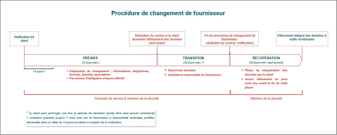 A noter sur les services supplémentaires : un fournisseur peut facturer, sur demande du client et avec accord préalable sur le prix, des prestations (i) allant au-delà des obligations de base (ex. assistance à la reconstruction de données chez le nouveau prestataire, conseil d’architecture, développements spécifiques) et (ii) qui pourraient réalisées par un autre prestataire que le fournisseur d’origine.